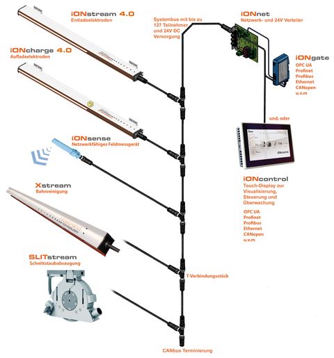 Das iONstream 4.0 ist ein elektrostatisches Hochleistungs-AUTO DC Technology® Entladesystem. Es vereint die neueste technologische Entwicklung und ist Mikroprozessor gesteuert mit lokaler "embedded" Intelligenz. Elektroden-Verschmutzung, Emitterspitzen-Zustand sowie Neutralisierungseffizienz werden kontinuierlich überwacht und visualisiert. Zugriff auf die Parameter und Daten erfolgt entweder über ein GateWay oder über den Touch Panel iONcontrol. Somit können einfachst für den Anwender Systemdaten ausgelesen werden. Der speziell entwickelte AUTO DC Technology® Modus, erkennt die Polarität der Ladung auf der Substratoberfläche und passt das Puls/Pausen-Verhältnis perfekt an diese Bedingungen an. Dadurch garantiert das Ionisationssystem zu jeder Zeit die best möglichen Entladeergebnisse. Alle elektronischen Komponenten sowie die Hochspannungsnetzteile sind im Elektrodenprofil integriert. Erhältlich ist das System in 3 Varianten (6, 12, 18 kV) für normale, grosse und sehr grosse Wirkabstände sowie sehr hohe Bahngeschwindigkeiten.